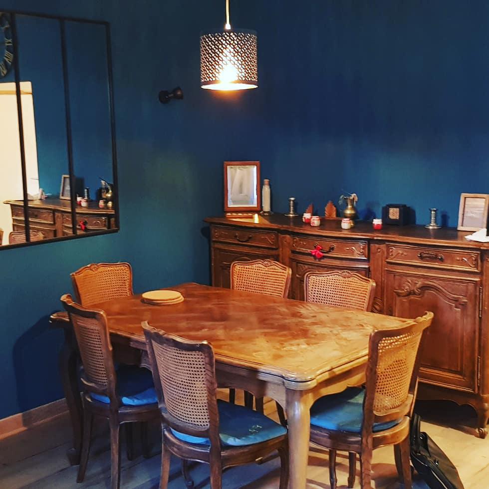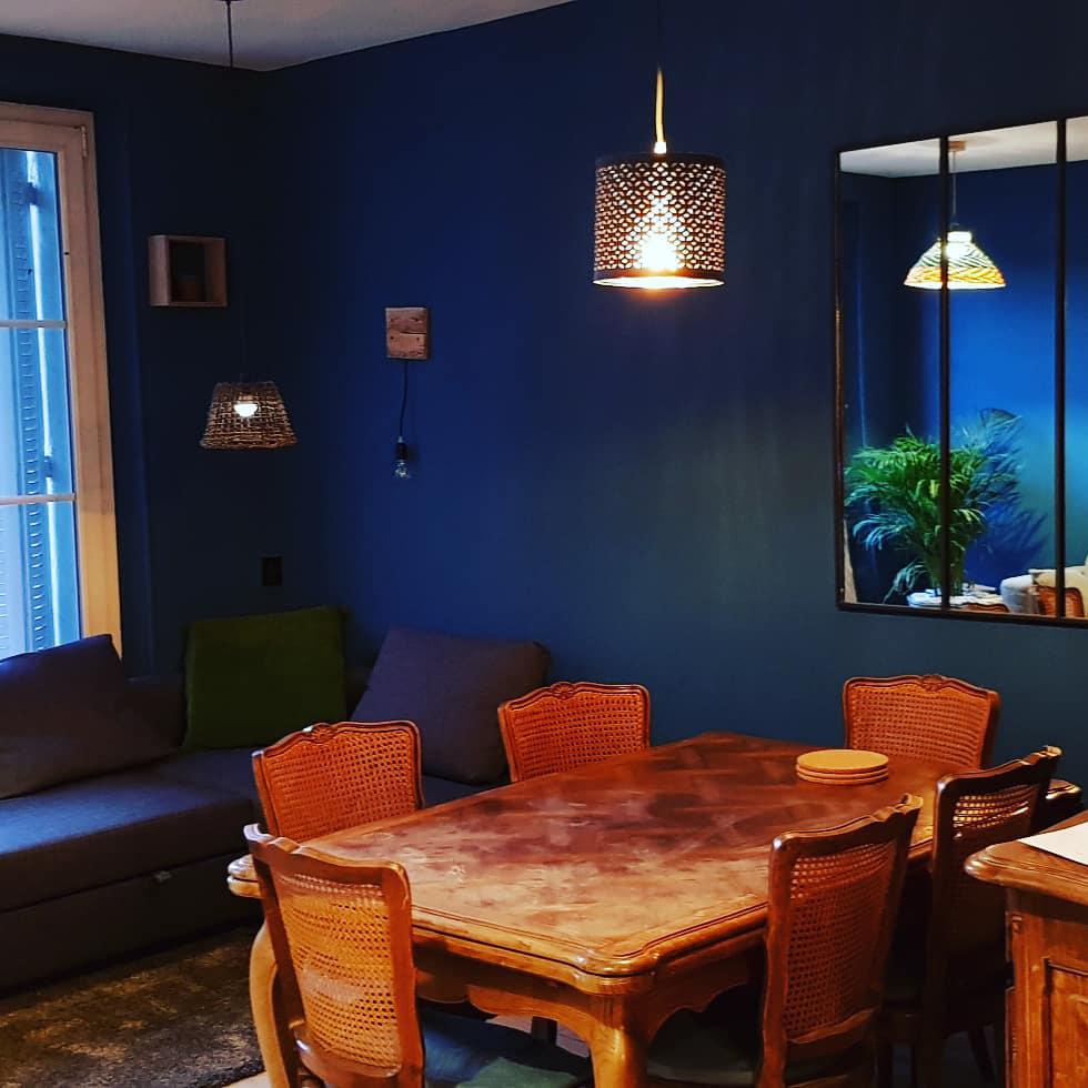 Vous arrivez ensuite dans le salon / salle à manger avec un canapé d'angle convertible (deux couchages), un canapé fixe gris (3 places assises), une grande table à manger avec 6 chaises. Il n'y a pas de téléviseur! Un espace a été aménagé avec des livres et magasines, ainsi que des jeux de sociétés.